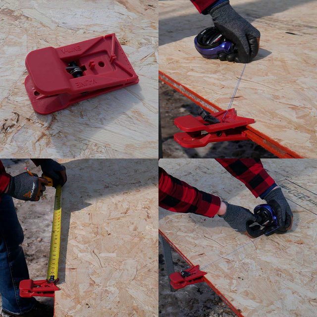 This V-Line clamp is the perfect tool for snapping lines on plywood. Just clamp it to your mark on the edge of the plywood and hook the end of your chalk line to it. It even works on super sharp angles. It also has a spot to hook your tape measure on, which is nice when you have to measure over from some spot in the middle of the sheet instead of the end.