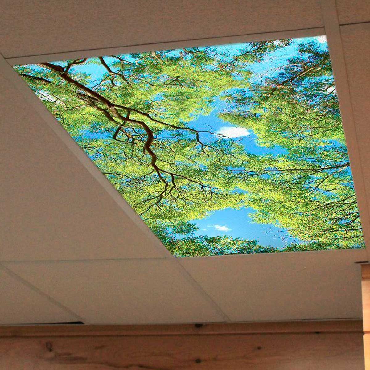Whether laying on your bed, relaxing on the couch or doing the dishes in the kitchen, a fluorescent light above you can be shifted from harsh to heavenly with this fluorescent light cover. It features the peaceful scene of a canopy of trees beneath a bright blue sky.