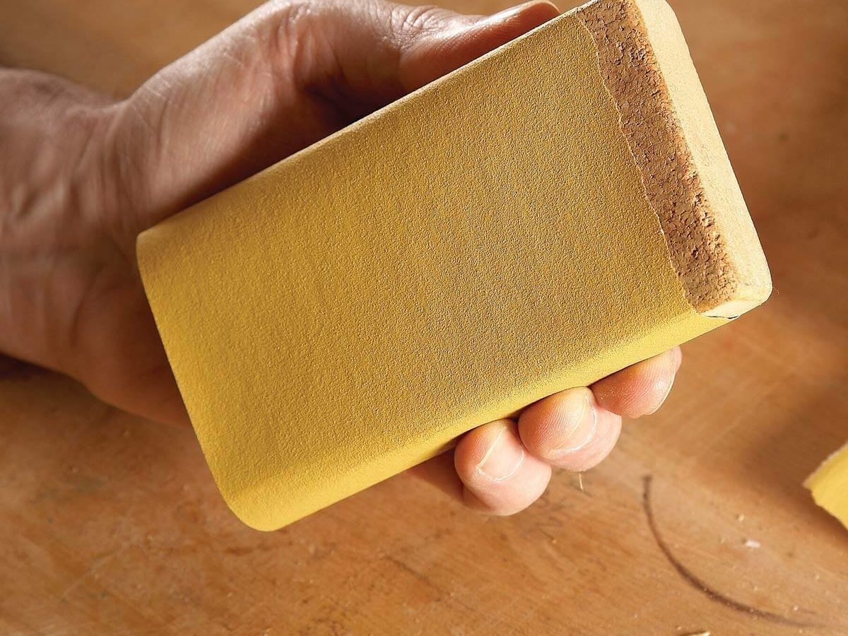 To keep the sandpaper from tearing on the edges of his 2-1/2 x 5-in. wooden sanding blocks (custom-made to fit quarter sheets), Ken glued a layer of cork on the bottom.