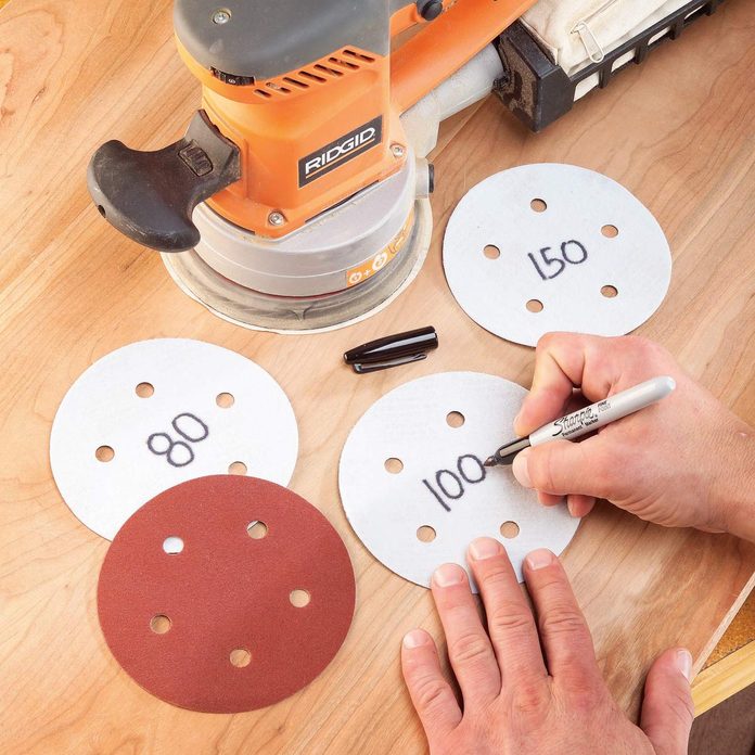 Hook-and-loop sanding discs work great on sanding jobs, and you can reuse them several times before they’re worn out. But it’s almost impossible to read the grit labels on the discs after you’ve used them once because the markings get scrubbed off by the loops. Do this: Whenever you open a new pack of discs, write the grit label on the back with a permanent marker. Now you’ll switch from grit to grit without straining your eyes.