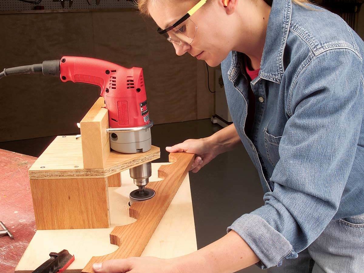 This easy-to-build jig transforms an electric drill into a stationary edge sander for inside curves on all kinds of projects. To build one, you need some scrap 3/4-in. plywood, a short 2×4, a 3/8-in.-diameter U-bolt to fit around your drill and two 3/8- in. wing nuts. Housing design and chuck length vary from drill to drill, so we won’t list the exact dimensions.