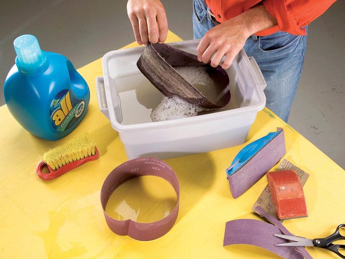Fill a bucket with hot water and laundry detergent, mix well, then toss in the pitch-covered, burned-out belts. Let them soak for several minutes, then scrub off the loosened debris with a stiff-bristled plastic brush. Set the belts aside, and when they’re dry, cut them into wide strips for sanding blocks or narrower pieces for freehand use on delicate or hard-to-reach sanding jobs. Resist the temptation to put the belts back on your power sanders; just use them for hand-sanding.