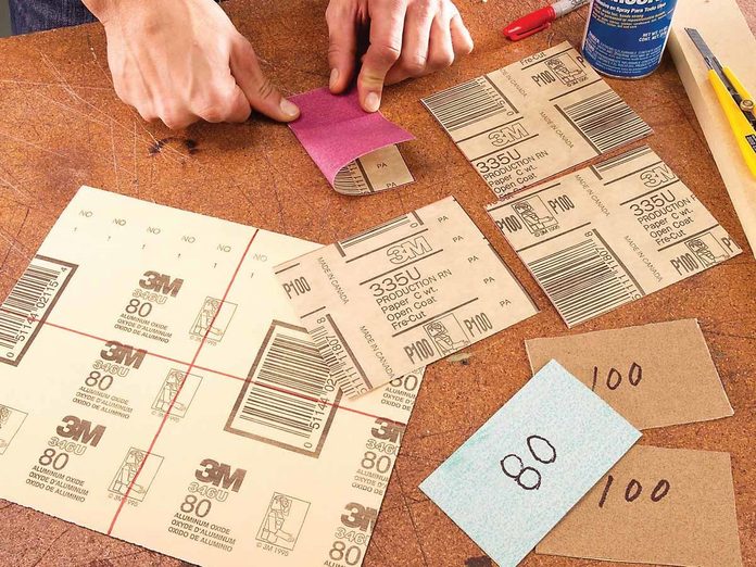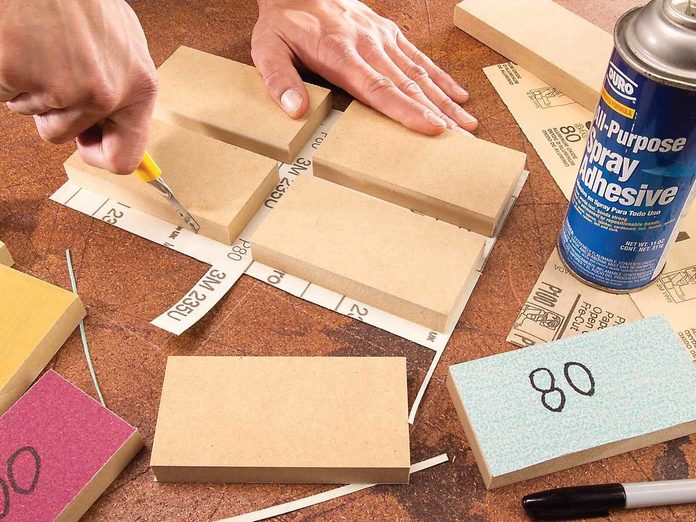 Then space the blocks—six per sheet—on sandpaper coated with spray adhesive. With a sharp utility knife, trim the sandpaper flush with the blocks. Write the grit size on the sandpaper with a permanent marker. It’ll be easy to find the grit you need, and the ink won’t stain your wood.