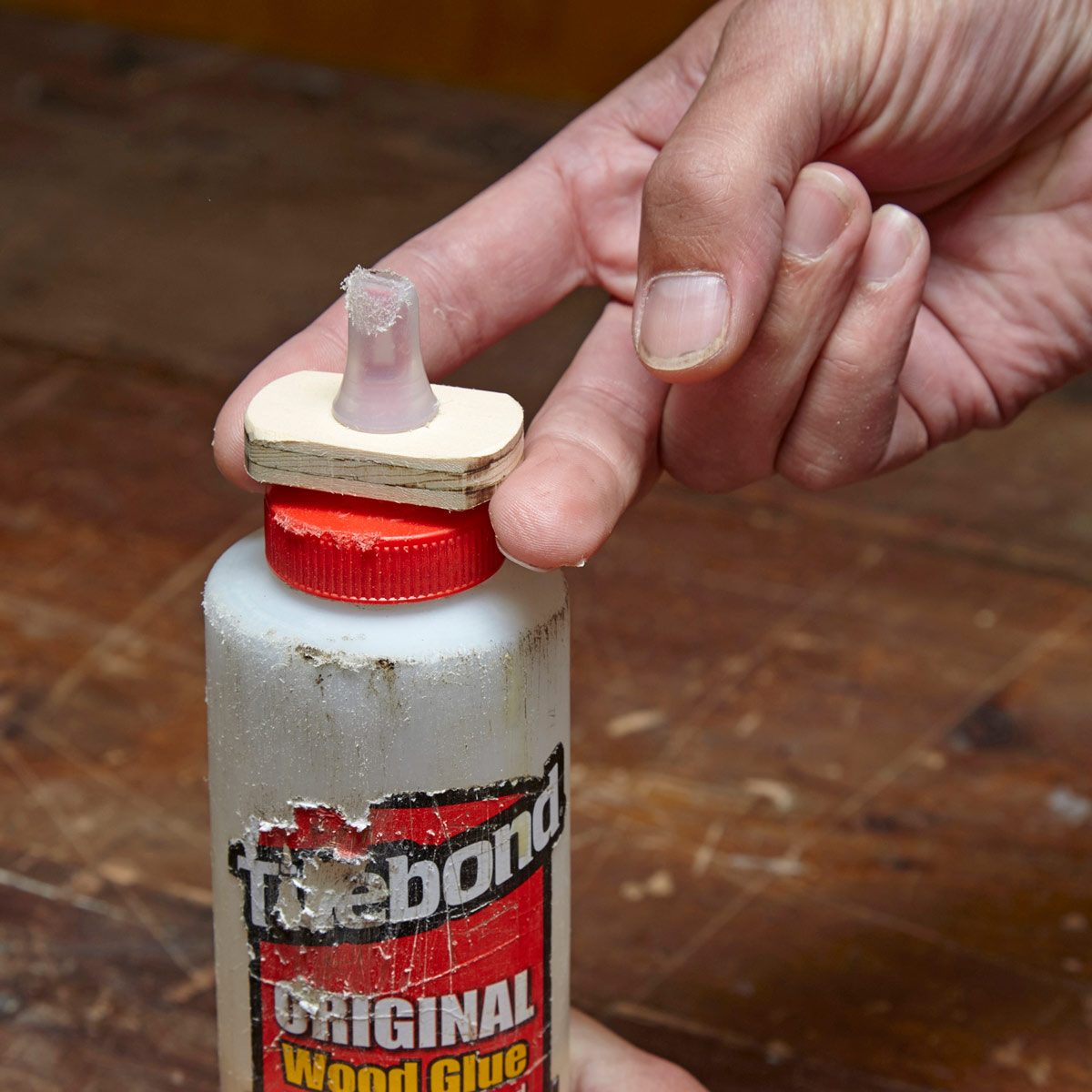Sometimes it’s hard to pull open the nozzle on a bottle of wood glue, so cut a small piece of wood with a hole in the middle and install it between the nozzle and the bottle. The wooden handle is much easier to grab and pull open.
