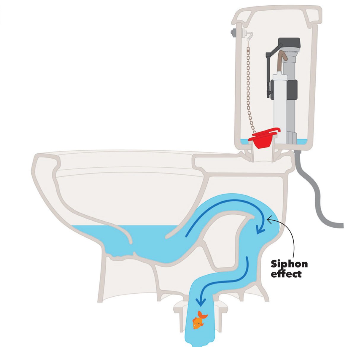 Water rushing over the top of the trapway creates suction, evacuating the waste and water from the bowl. As the water is pulled from the bowl, air enters the trapway, ending the siphon effect and also the flush.