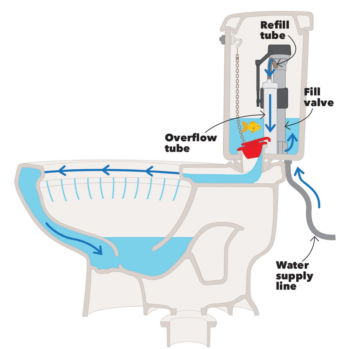 Water rushes back into the tank via the fill valve, which is connected to the water supply line. The refill tube sends water down the overflow tube to the bowl.