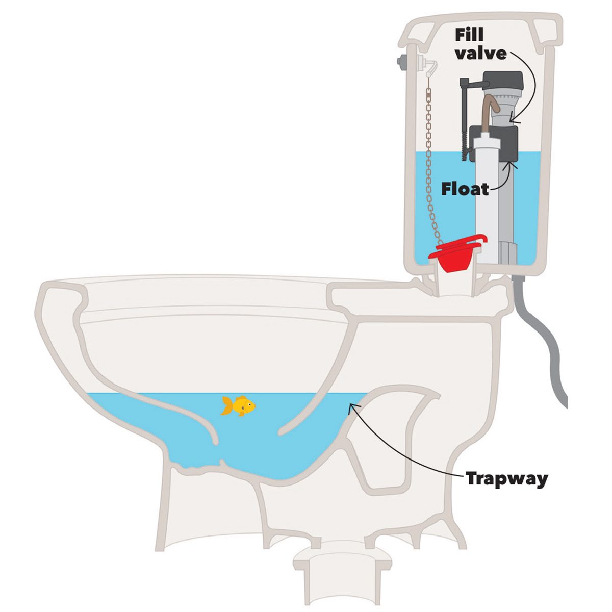 As the tank water rises, it lifts the float until it shuts off the fill valve. The water in the bowl and the water in the trapway reach a common level, just below the top of the trapway. Check out our best toilet buying tips here.