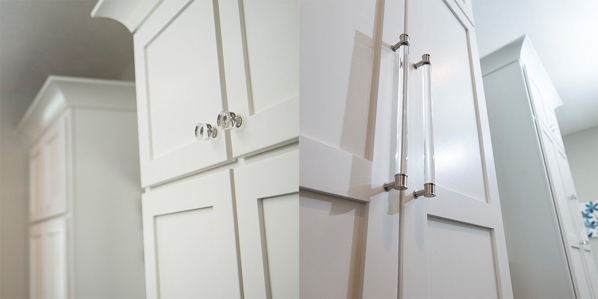Overall, the hardware needs to FEEL right. From an aesthetic standpoint, if the design or size of the hardware overshadows the kitchen, then it is too big. There are some physical limitations to think about, like how pulls and knobs with large overhands or profiles can easily get caught on clothing. The hardware needs to be easily gripped. Since pulls tend to have a short profile, you need to make it easy for people with larger hands to use them. Nothing is more frustrating than non-functional hardware, no matter how good it looks. If you are choosing hardware from a showroom, test how it feels in use.
