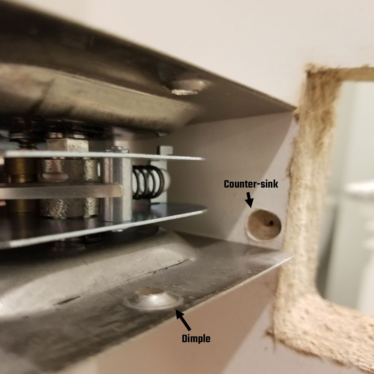 Loosen the front machine screws and slide the latch in place, and then drill a couple of pilot holes for the wood screws. There is a dimple where the screw goes through the side of the hardware that normally causes the plate to stick out a little bit. To get a tight fit I drill a counter-sink hole then reinstall all the screws (below).