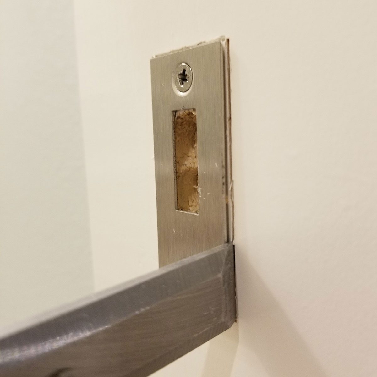 When it comes to locating the striker plate there isn’t a lot of wiggle room. I extend the latch and mark where it hits the jamb then temporarily screw the plate in place.