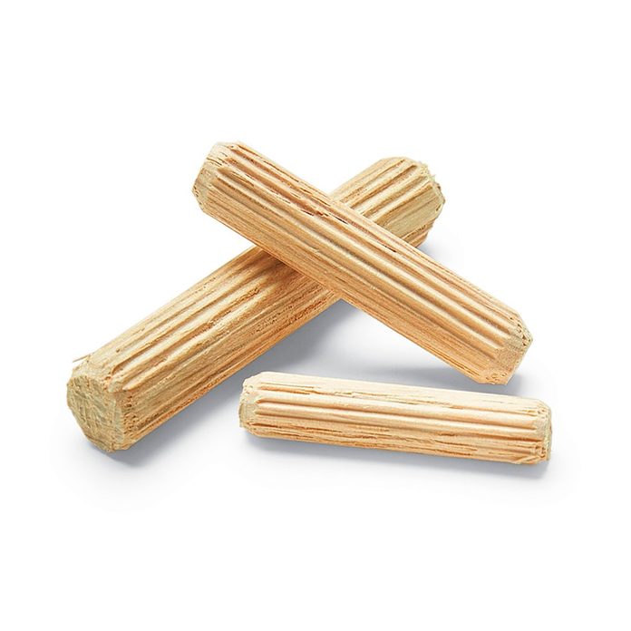 Manufactured dowels with ribbed sides are much better than dowels made at home from smooth dowel rod. Fluted dowels are stronger, fit better and are easier to glue. When you clamp a joint together, excess glue in the hole flows up and out of the flutes. A bag of 20 costs only $2 at home centers.