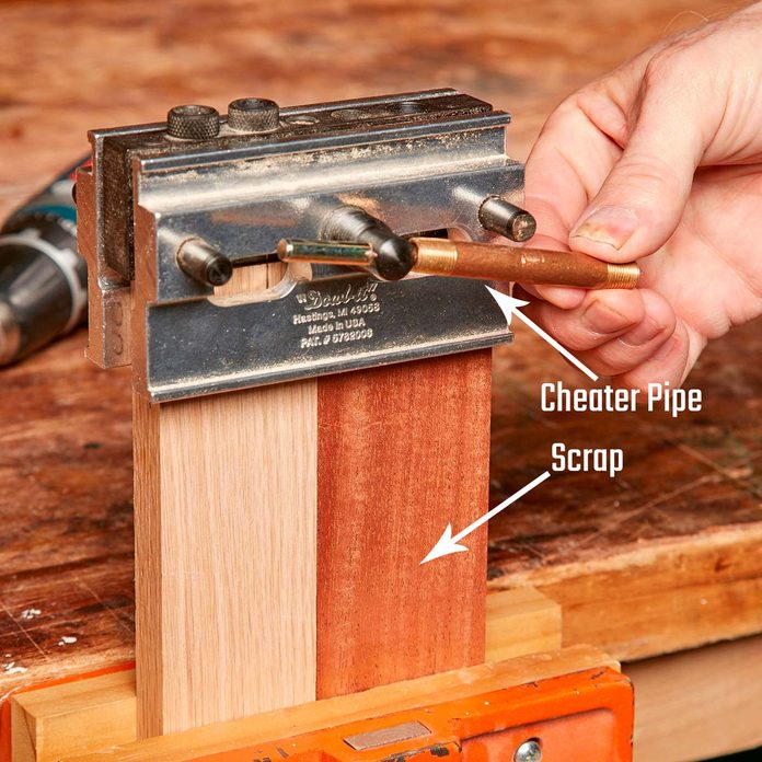 When drilling into the end of a part, place a scrap of the same thickness next to it. This keeps the jig straight while you tighten it. A small pipe makes tightening easier.