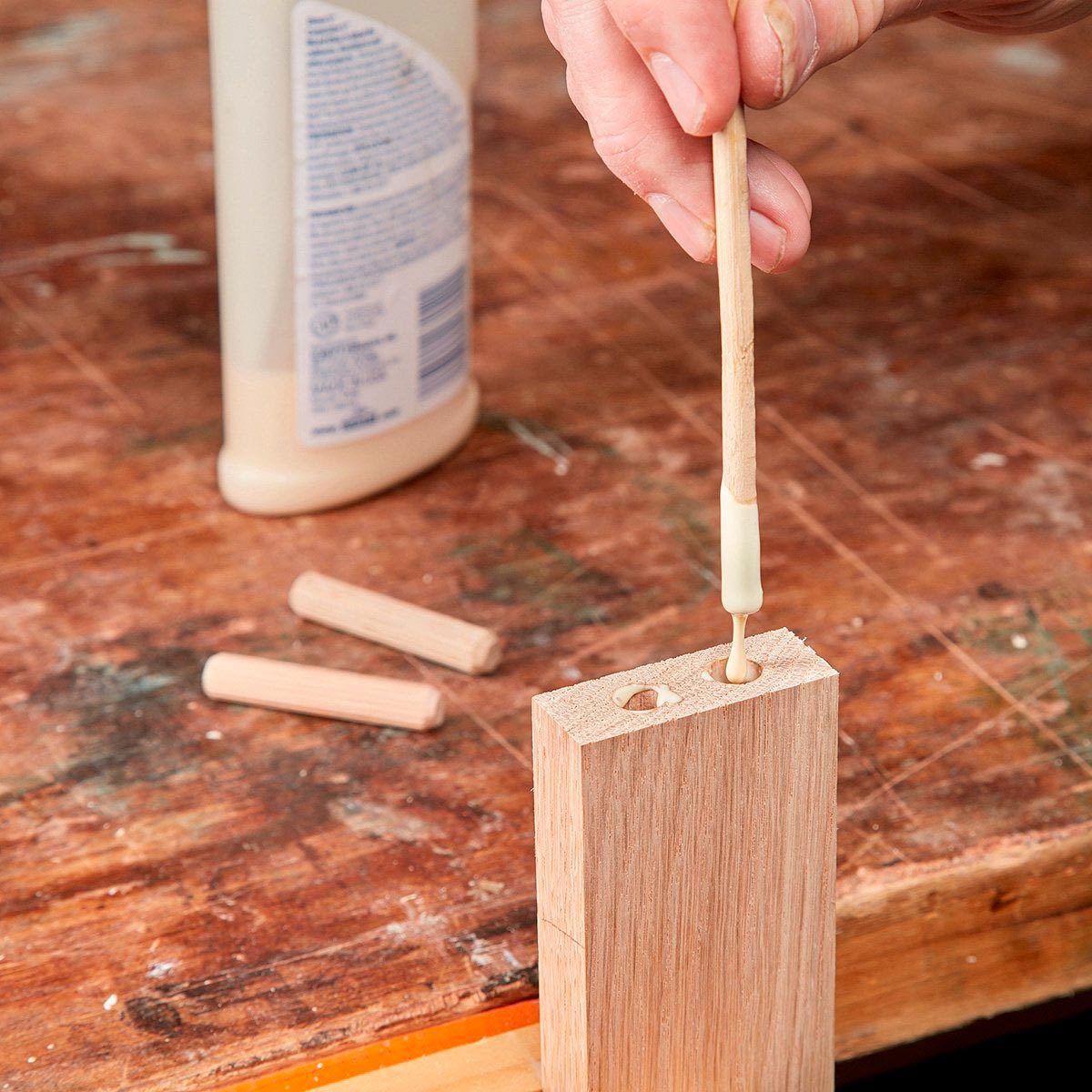 Before inserting a dowel, coat the inside of each hole with glue using a 5/16-in.-diameter craft stick. Apply more glue to the surfaces around the holes and to the dowel pins with a small brush.
