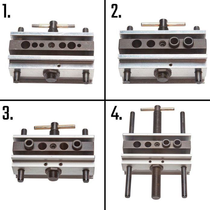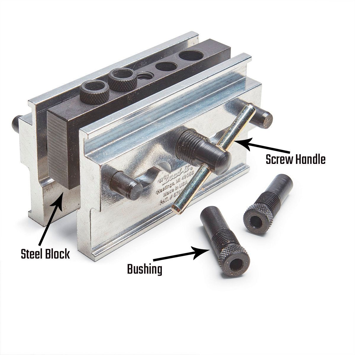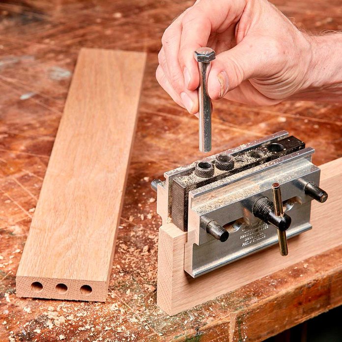 The heart of the jig is a steel block with holes to guide your drill bit. On many models, the holes are threaded, which lets you install bushings for drill bits of various sizes. The holes are precisely perpendicular and located in the exact center of the block.