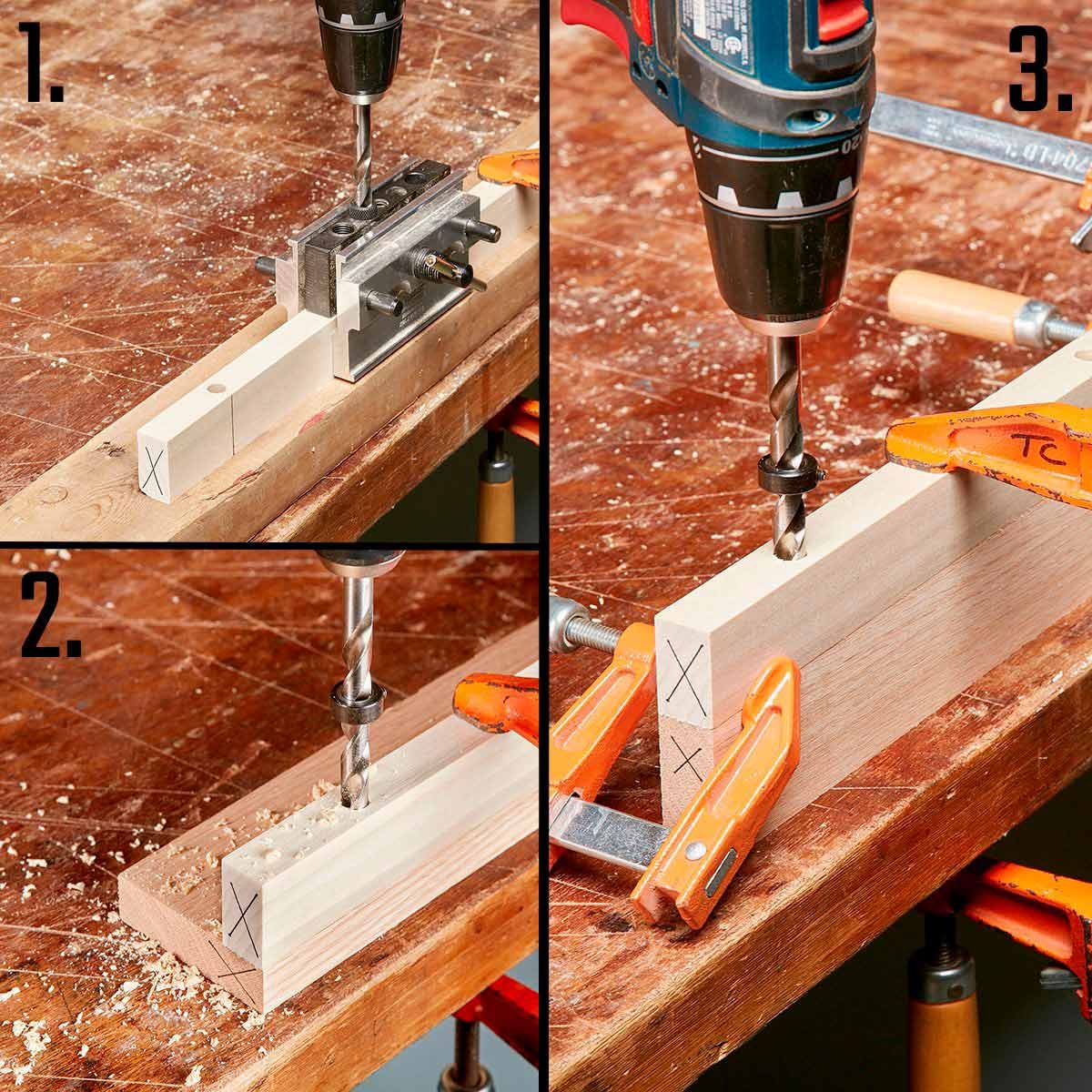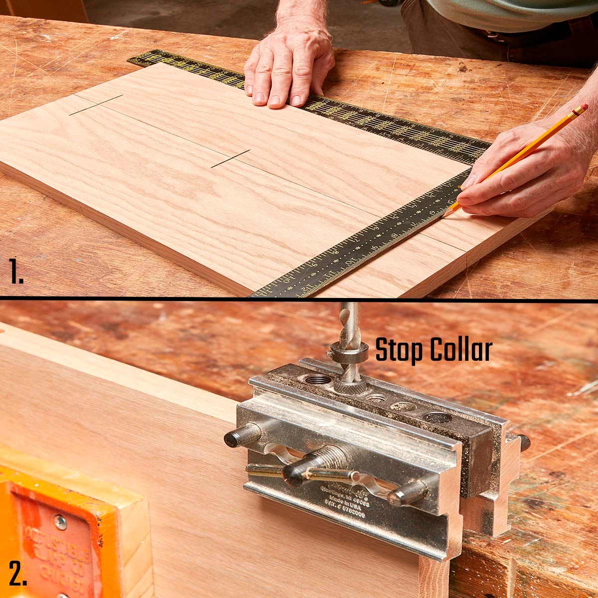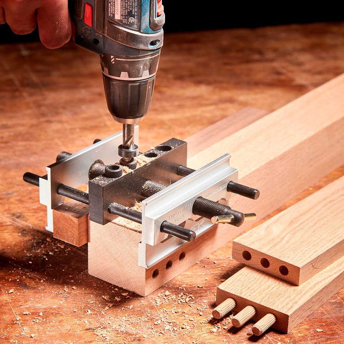 - Drill dowel holes. Align the jig with the center lines and drill. Control the hole’s depth using a stop collar. Glue dowels into one set of holes. Measure how far each one sticks out; cut any that are too long. Glue the boards together, then cut them to final length.