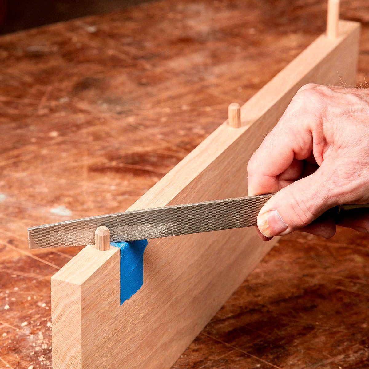 The spacing between holes must be precise for two parts to fit together. If you find the spacing isn’t quite right, file one side of a dowel pin to make it skinnier. Put a few layers of tape under the file so you don’t mar the wood.