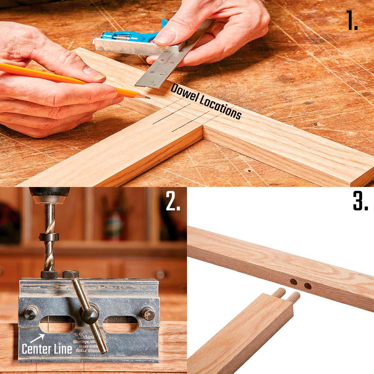 - Assemble. Add dowels and glue for a fast, strong, perfectly aligned joint. Next I’ll go into more detail on how to make specific types of joints.