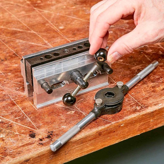The short handle on a doweling jig can dig into your hand when you loosen or tighten the jig. One solution is to use a cheater pipe, but heress a better one: Add round knobs ($4 each at a hardware store). Cut threads on the handle using a 1/4-20 die. Ready for more? Check out these dirt-simple woodworking jigs you need for your home shop.
