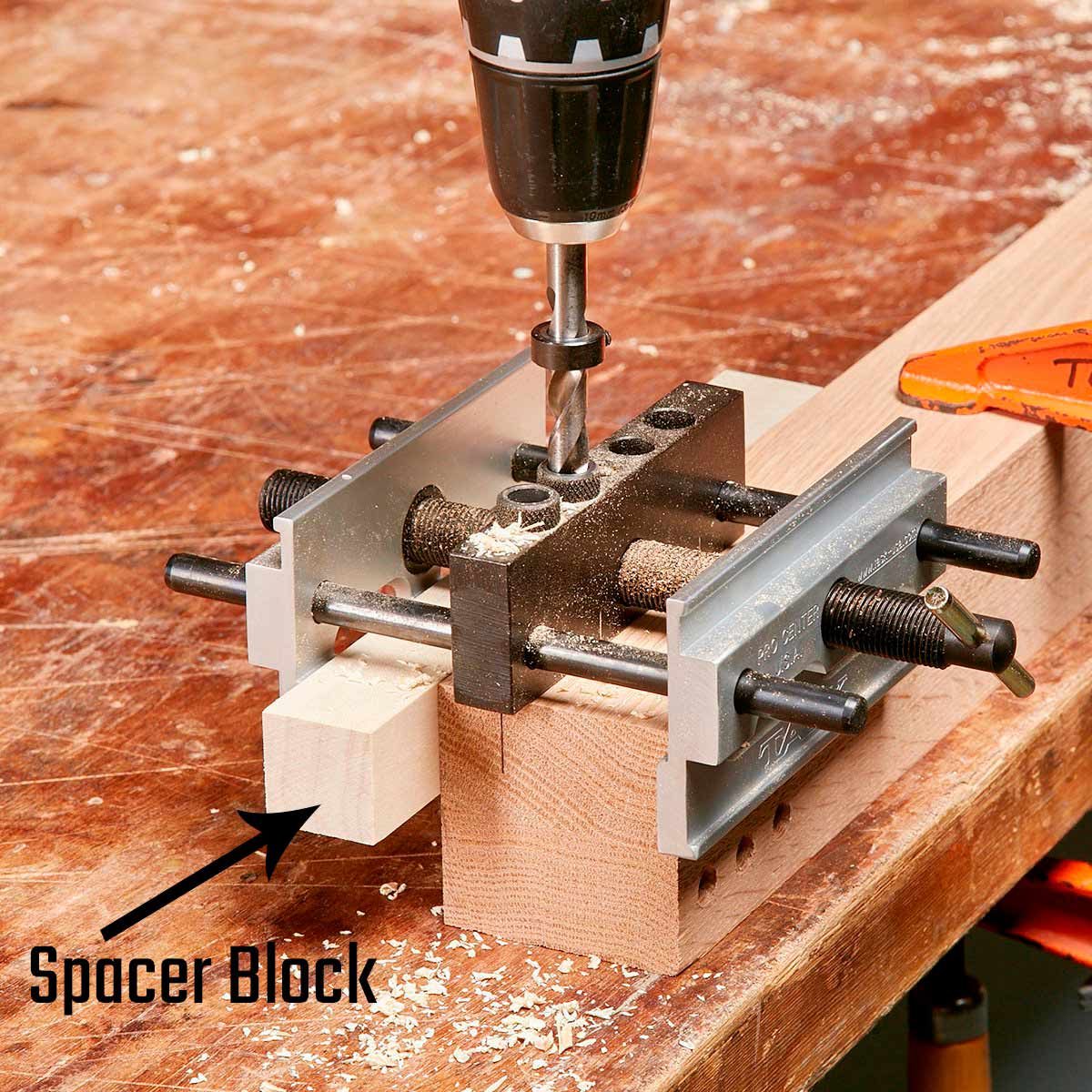 Position dowel holes off-center by placing a block against the workpiece. Then drill the holes as usual.