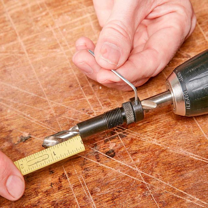 When you buy a doweling jig, pick up a set of drill bit stop collars ($3). A collar prevents you from drilling too deep, which can be a disaster. The easiest way to position a collar is by using one of the bushings from your jig. Measure to the beginning of the bit’s tip, not to the pointed end. Add 1/16 in. to allow space for glue at the bottom of the hole. This bit is set up to drill a hole 1-1/16 in. deep, perfect for a 2-in. dowel.