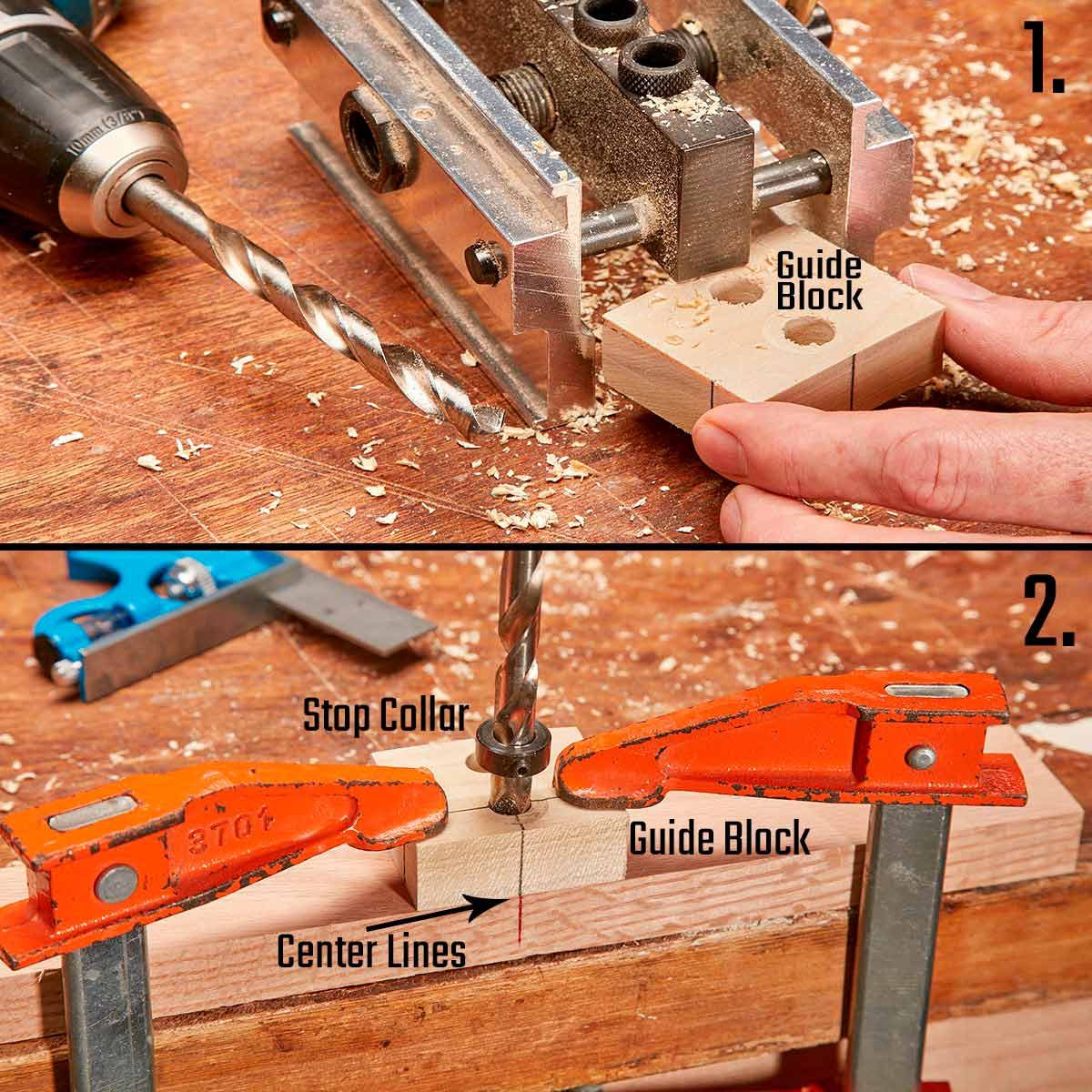 - Make a guide block. Drill two holes through a block, using the jig to position the holes perfectly.