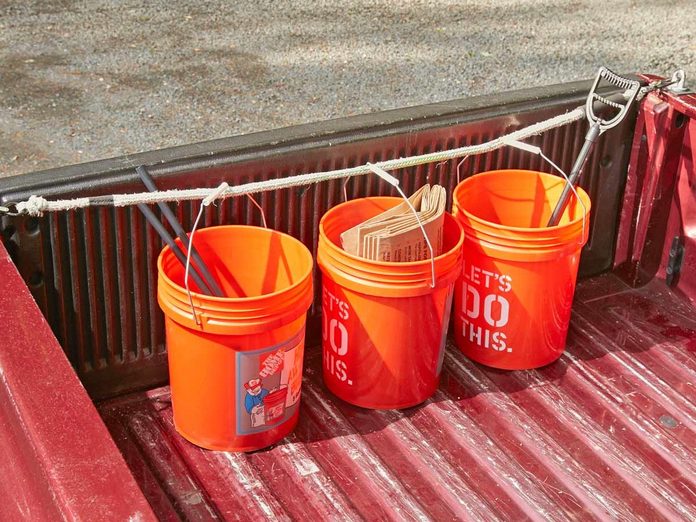I use a lot of 5 gallon pails to store tools and other construction gear in my pickup. But I was frustrated because they were always sliding around and tipping, and I couldn’t always reach them without climbing up into the bed. My solution: Secure them in the pickup bed with bungee cords. Now they stay put! — Tim Horky.