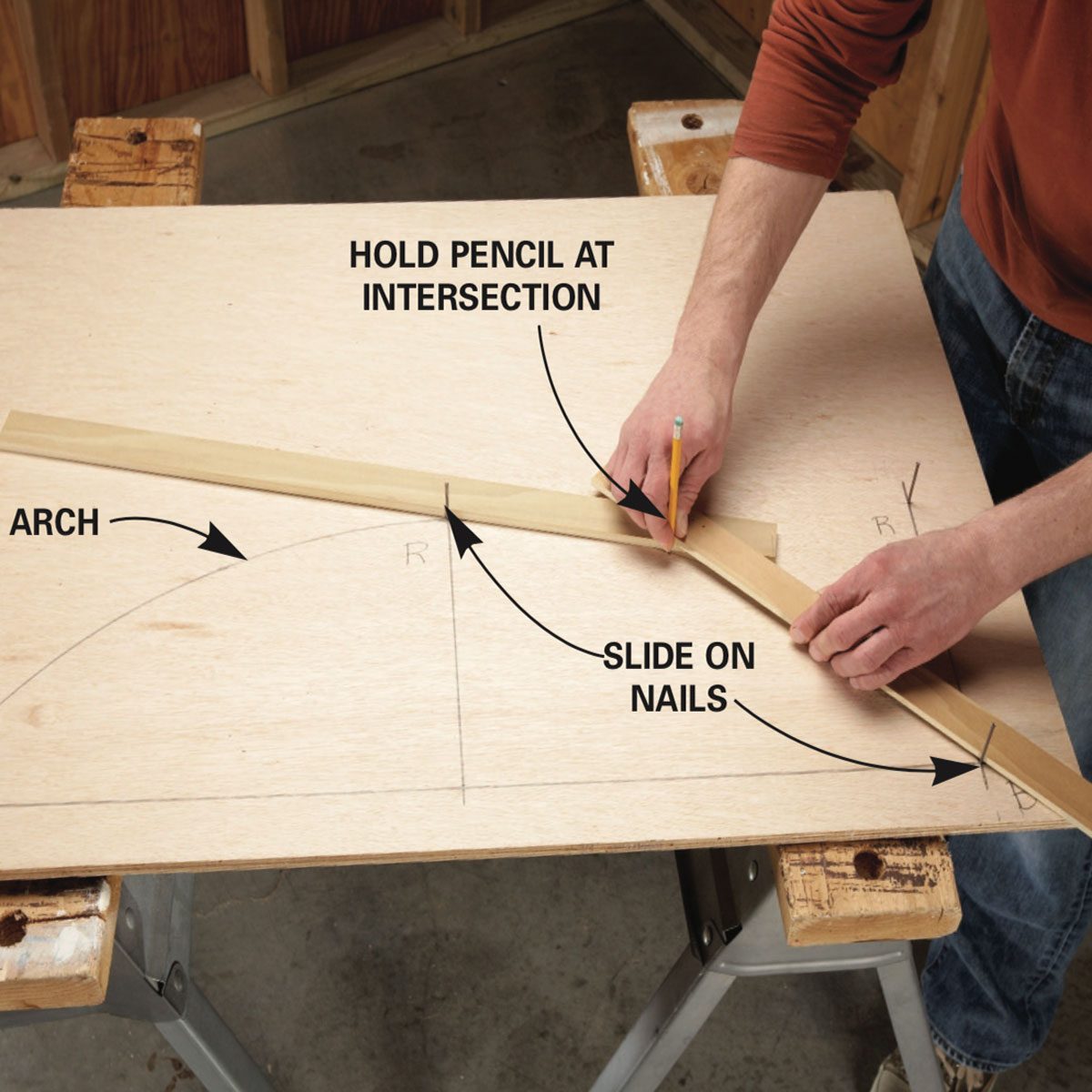 That last tip was great, but if you need an odd sized or uneven curve, you’ll need to push your marking game to the next level. Create much larger arcs with this hack: lay out the plan for your arc by figuring the bottom corners and peak, setting a nail or dowel at those points and at least one of the top corners. Then set two pieces of flat stock on the plan, one angled from the bottom to the peak, and the other from the peak to the opposite top corner. Fasten the two pieces of flat stock, then set a pencil in the juncture. Slide the stock pieces across the peak and bottom corner markers, and your pencil will mark a perfect arc.