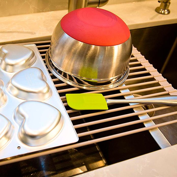If you like each type of dish you wash to have it’s designated spot to dry, check out this two-tier kitchen dish drying rack and storage system. Made with heavy-duty and rust-resistant chromed wire, it’s designed to hold plates on the top tier, while the flat bottom rack can be used for mugs and bowls. One side is even equipped with a cup drainer and the other side has a cutlery drying basket. Check out these 7 dishwashing mistakes you’re making.