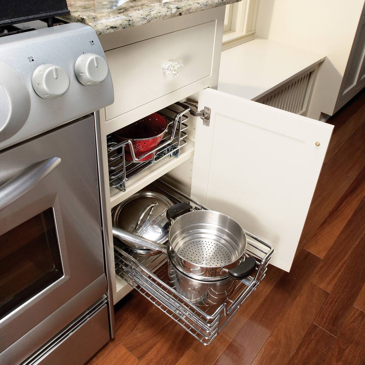 If you don’t want to make the rollouts yourself, you can shop for moderately priced yet sturdy rollouts online or at Lowe’s and Home Depot. You simply mount them to the existing shelves in your cabinets with four screws.