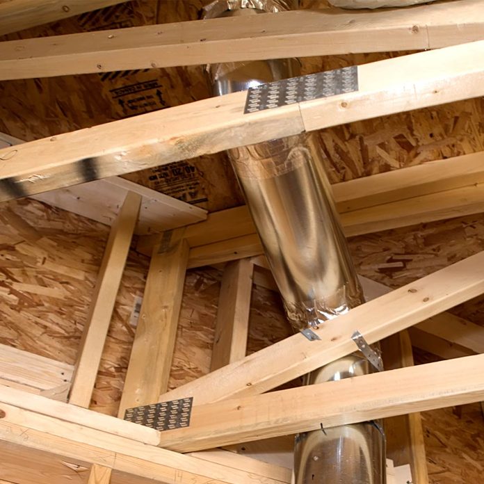 If the ducts are going to be concealed, all seams need to be taped or caulked. Here’s Bob’s trick for taping a seam on a pipe that’s installed close to the subfloor: Cut a piece of foil tape to length. Peel off part of the backing. Slide the backing up and over the pipe. Finally, pull down on the backing, which will pull the tape along with it. Inspectors will want to know you’ve used an approved tape, so buy the stuff with writing on it, or keep the roll on-site until inspection.