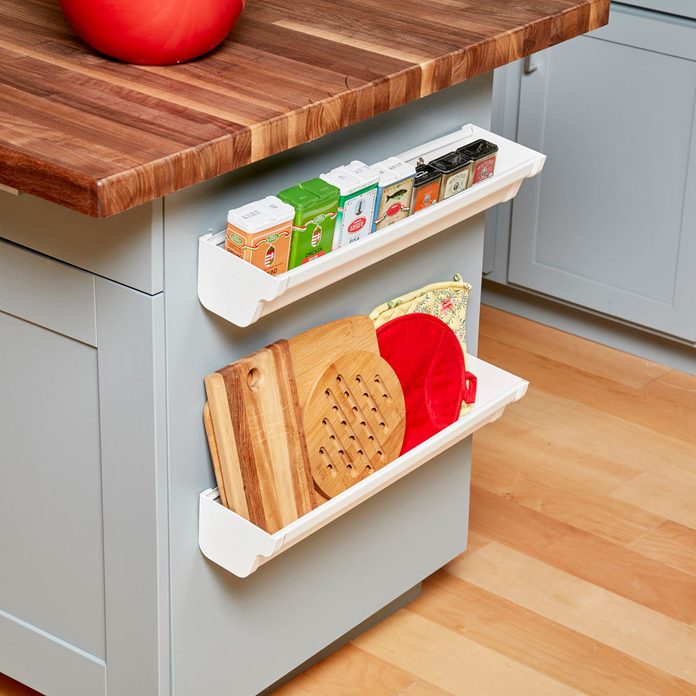 Whether it’s in the rafters of your garage, between joists in the ceiling of your basement, inside a cabinet, etc., maximize your home’s storage space by thinking outside of the box! For example, Family Handyman reader David Ojala uses gutters as storage shelves on the side of kitchen cabinets for one of the most creative hacks for home organization we’ve seen!