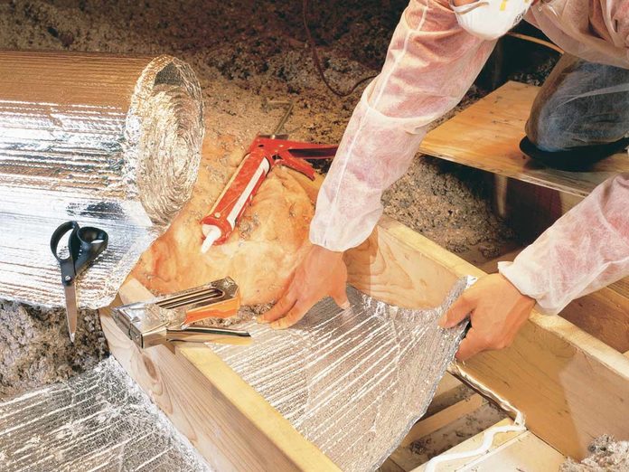 It’s flexible and only about 1/4-in. thick, making it easy to cut with a scissors. You have to clear insulation from the surrounding wood to get the caulk to stick. Then cover the foil with insulation when you’re finished.