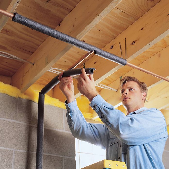 Place the pipe sleeve so the seam is face down on the pipe and use aluminum foil tape to secure the insulation to the pipe every foot or so. On gas water heaters, keep pipe insulation at least six inches from the flue.