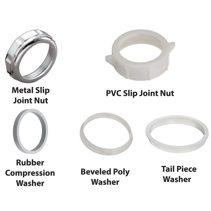 The same rule applies when working on drain lines. If you’ll be disassembling a metal p-trap and arm, make sure you have enough rubber compression gaskets to replace the gasket in every joint you disassemble. The beveled poly washers used on PVC traps and arms can be reused, but you should still have a few spares on hand in case you lose one or discover the old one is cracked.