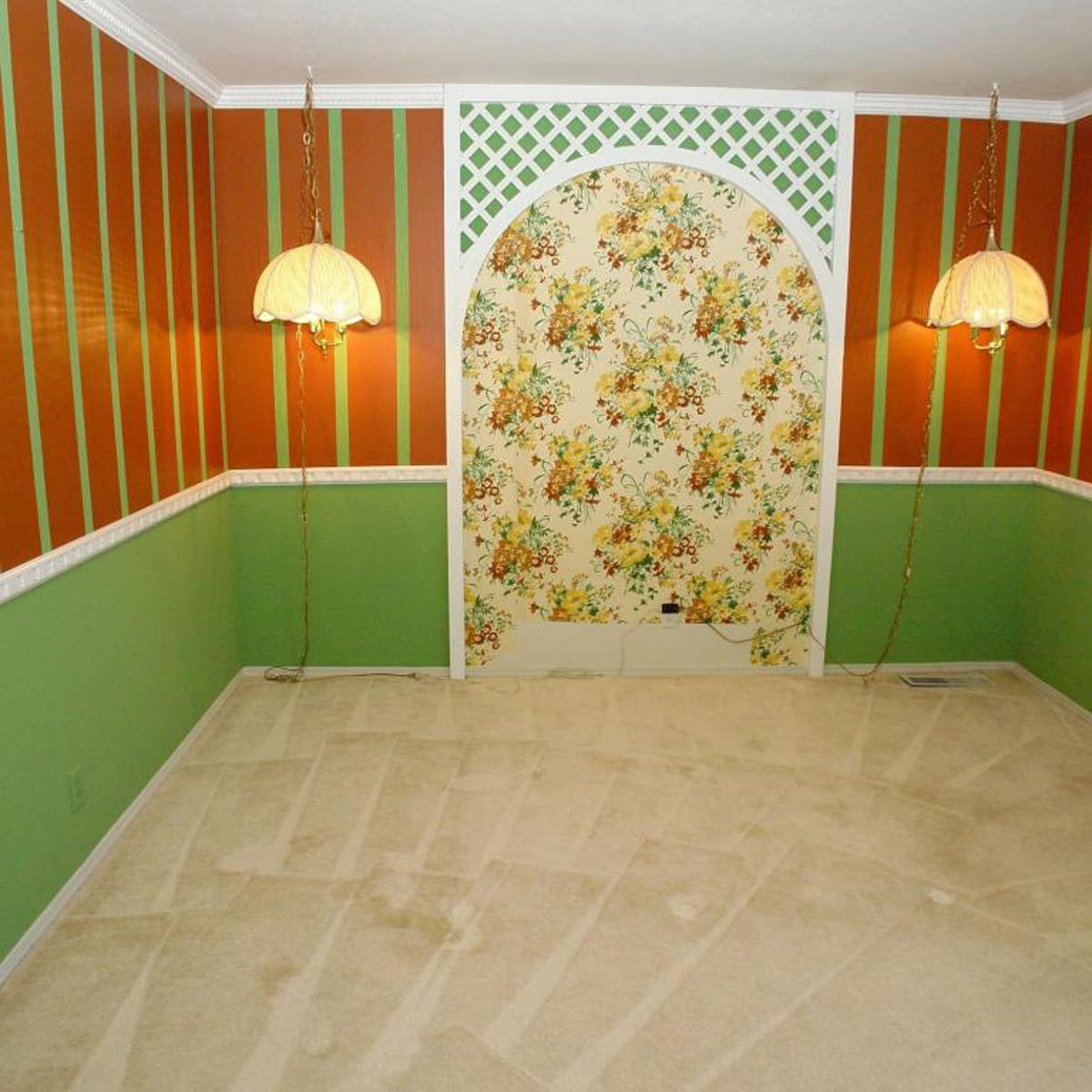 The wallpaper might need updating in this home. We’re not sure if this is supposed to create a garden scene in this room since it looks like a lattice garden arbor but it might be worth putting into consideration as a project room. Wallpaper is making a surprise comeback, but maybe just not this kind.