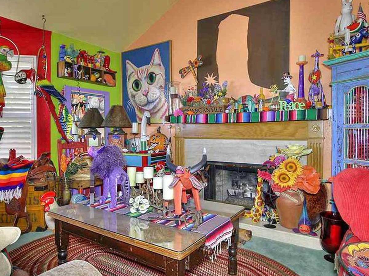 It’s hard to put a finger on this décor style something to do with Southwestern but with more color. It’s got our eyes as big as the cat’s in the picture. If there is a cat in the home, let’s hope it has some really cool cat furniture.