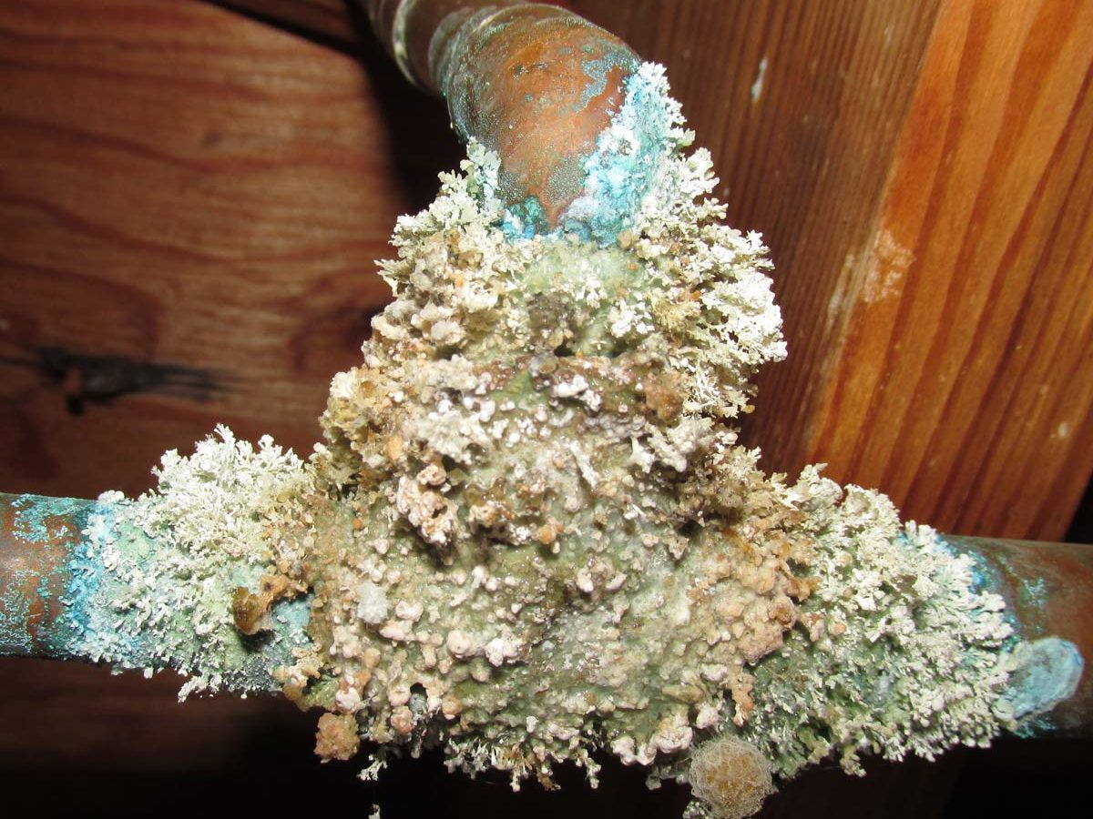 When you’ve this gross-looking scene, you’ve got an obvious problem. The white stuff is efflorescence and the green stuff is copper chloride, which is hazardous. Check out these 100 home disasters waiting to happen.