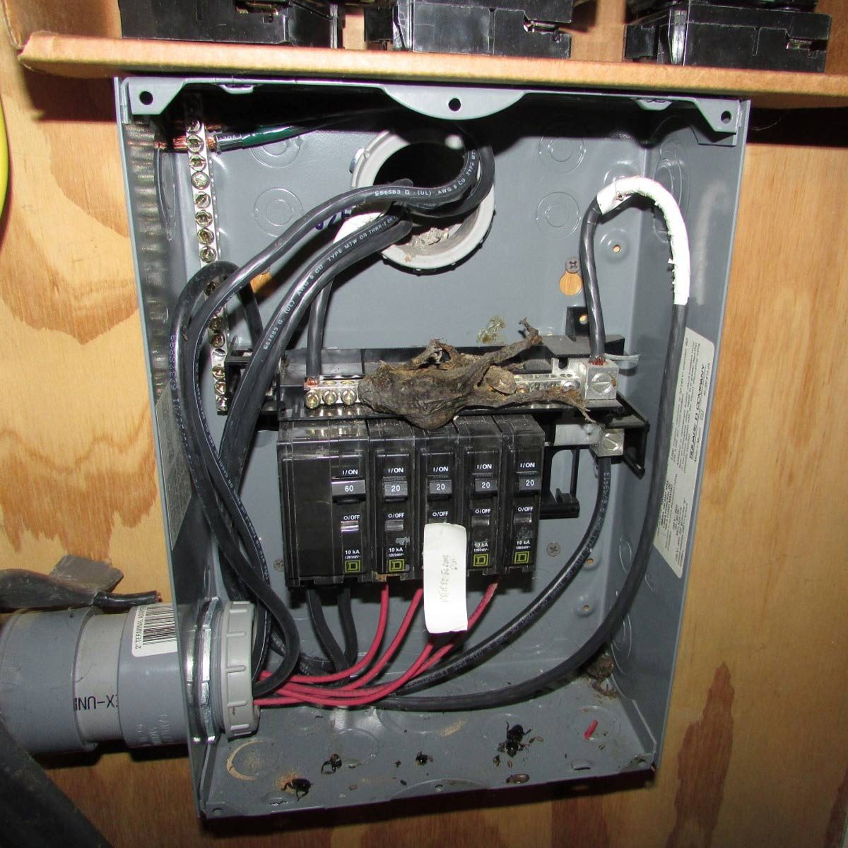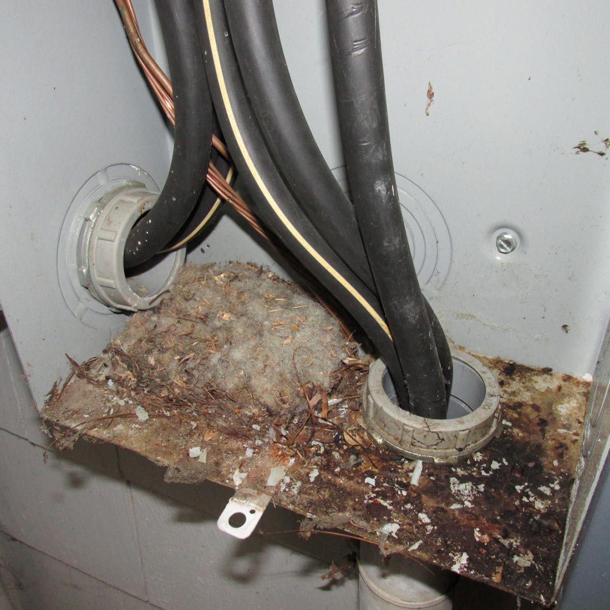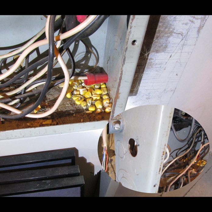 Notice the little hole in the panelboard on the inset photo and you’ll notice a clear entry way for rodents, who are known to infiltrate panelboards. Here’s how to keep those pests out of your home and dangerous areas.