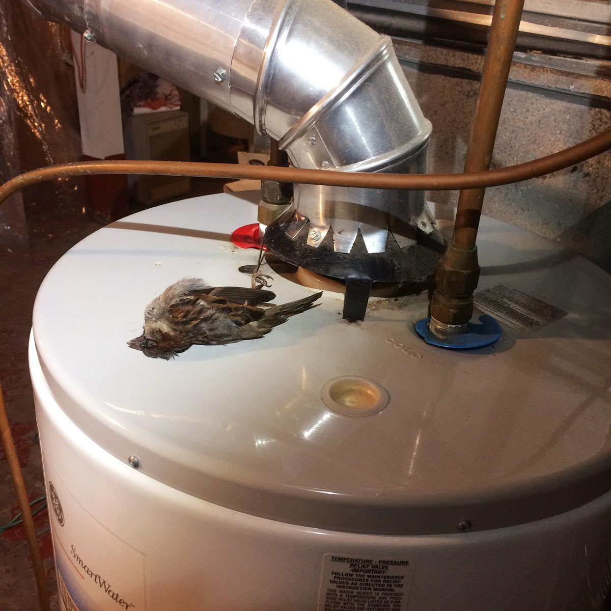 How does a sparrow end up dead on the water heater? In this case, it perched on the chimney, enjoying the warm exhaust. When carbon monoxide made it drowsy, it fell down the flue and managed to exit the water heater’s draft hood before expiring. It all began with a detached flue cap, which created a heated hangout for birds. But bad or missing caps can lead to bigger trouble: Rainwater can damage the flue, furnace or water heater.