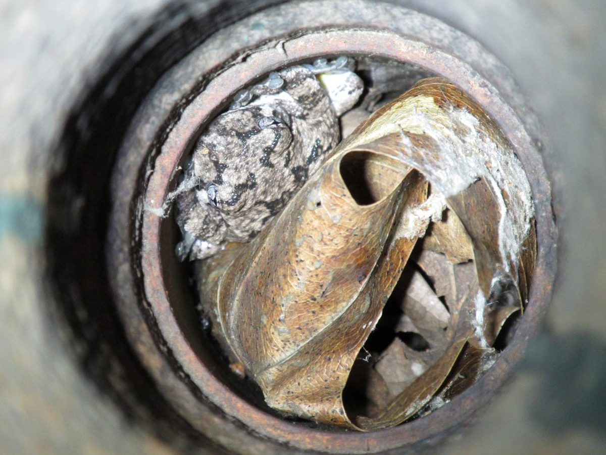 You never know what’s going to wander into strange places, like this toad that found a spot in a plumbing vent.