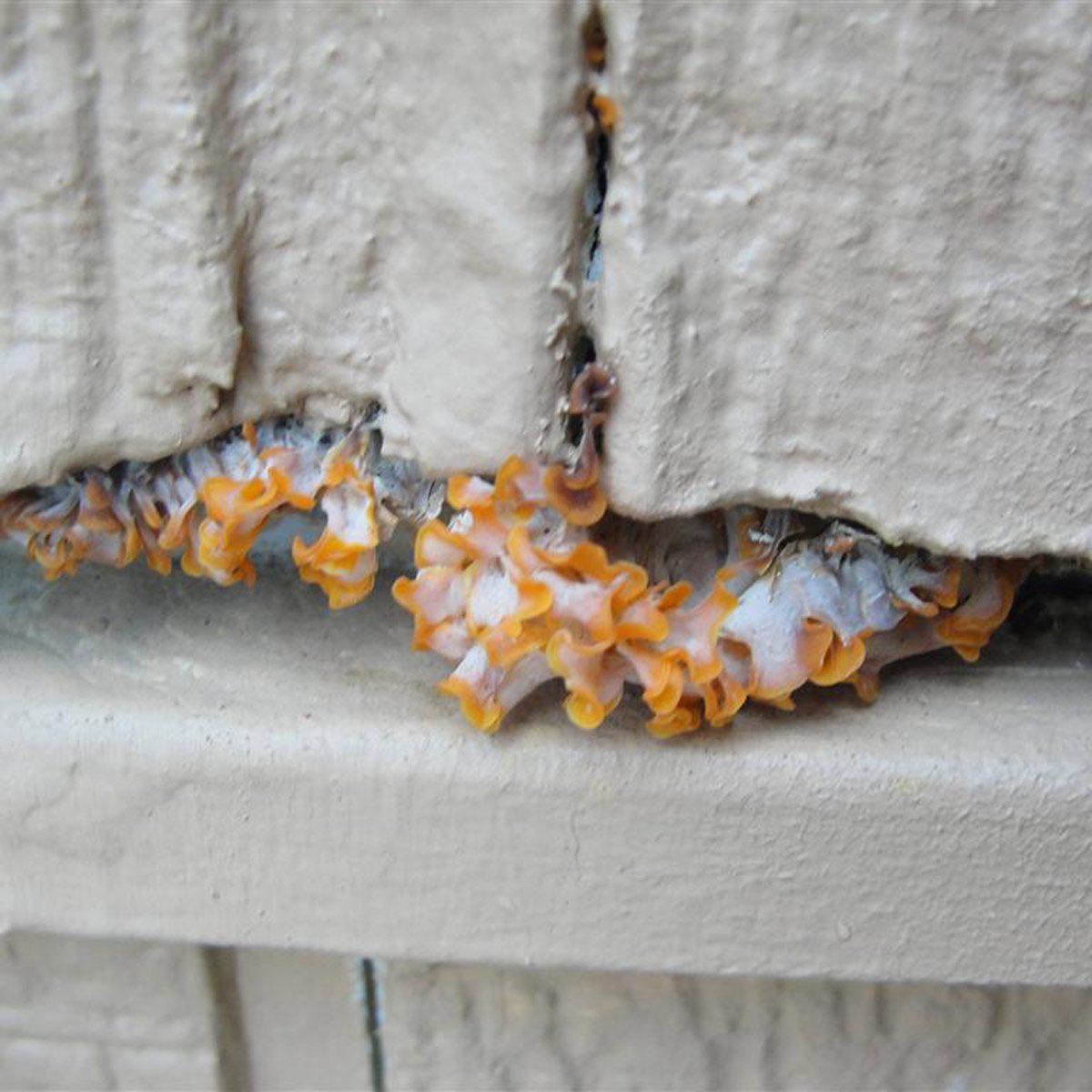 Mold and fungi have unusual forms and colors that make them gross-looking, like this orange fungus on the exterior of a home. Get vinyl siding cleaner with these tips.