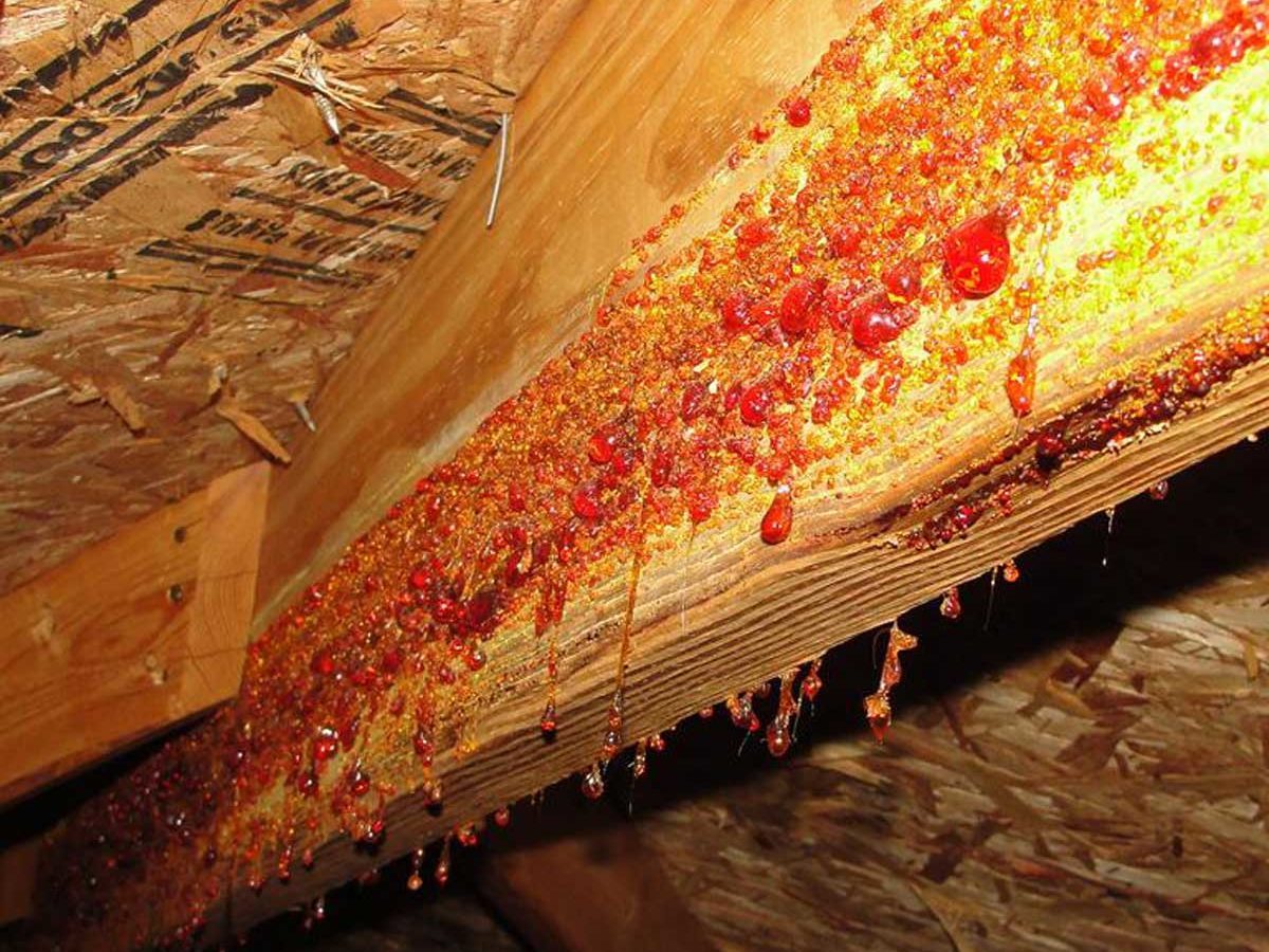 Sap appearing in the attic like this isn’t necessarily a problem, just kind of gross-looking for the time being. Some wood will ooze sap because of a hot attic. Find out the best tool to use for clearing tree sap off of siding.