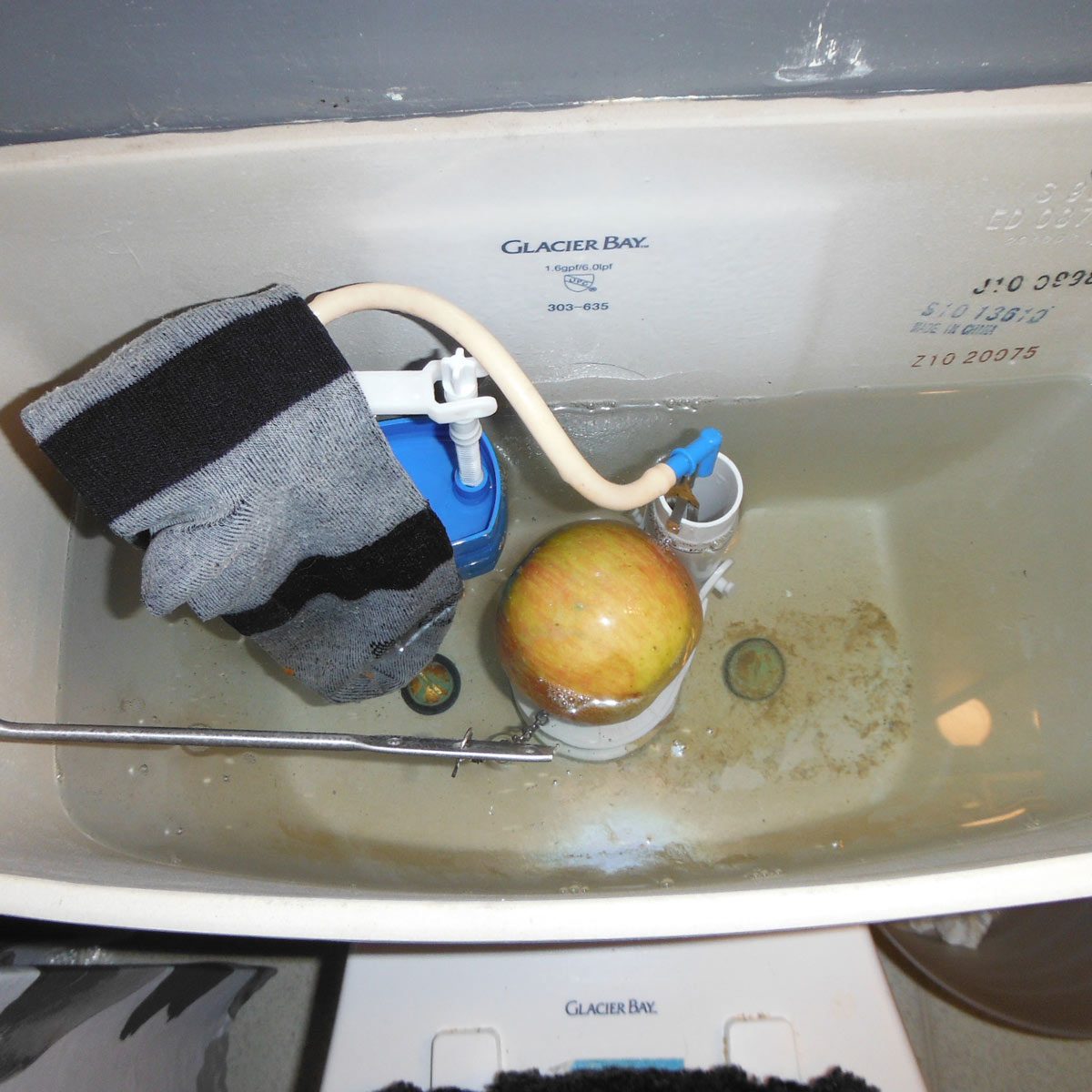 This might be one of the most creative DIY fixes for a broken toilet flapper but using an apple can’t be a long-term fix. The sock is a nice touch to prevent water from spraying everywhere, too. Here’s a better way to stop a running toilet.
