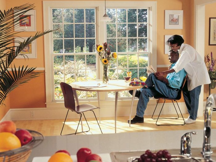 This perfectly ’90s kitchen decorated above the cabinets with some fake plants, which was acceptable then. It’s not any more and neither is the arched window, though it does provide a gorgeous fall view. These home improvement projects are affordable and easy.