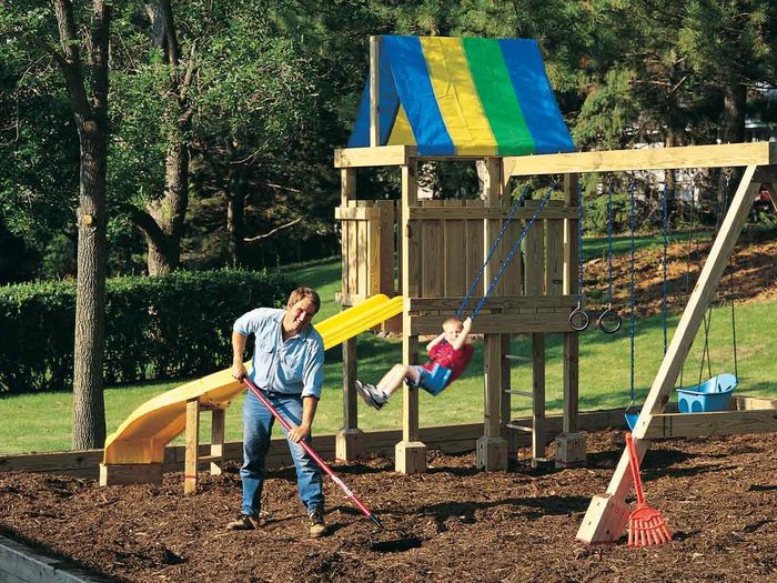 Any kind of playground around seemed to have a tower similar to this style in the ’90s. We showed people how to build this playground set to make it safe for kids to enjoy. We used mulch to make safe landing spots for kids jumping around. Check out awesome playsets that are out there now.