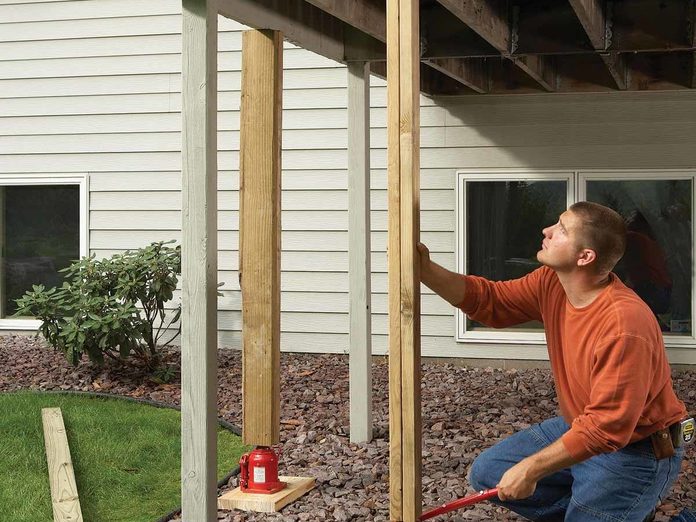 While well-built decks will last for decades it’s a good idea to perform an annual inspection on the whole structure to ensure everything is safe and in top shape for your family and guests. Problems to look for are rotted or wobbly posts, weak post connections, properly-fastened ledger boards, and missing flasher ledging. Most wood deck repair tasks are inexpensive and you should be able to complete them yourself.