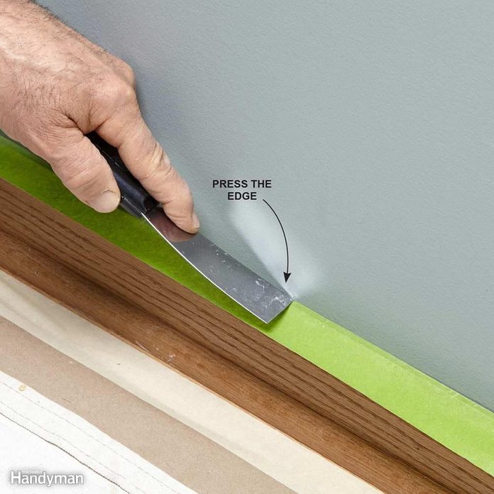 After you apply painter’s tape, make sure to press down the edge to seal it. Otherwise paint is sure to seep under the edge of the tape. A flexible putty knife works great. Start at one end of your tape run and pull the blade along the tape while applying downward pressure. Tilt the putty knife blade slightly so you’re applying pressure right along the edge of the tape.