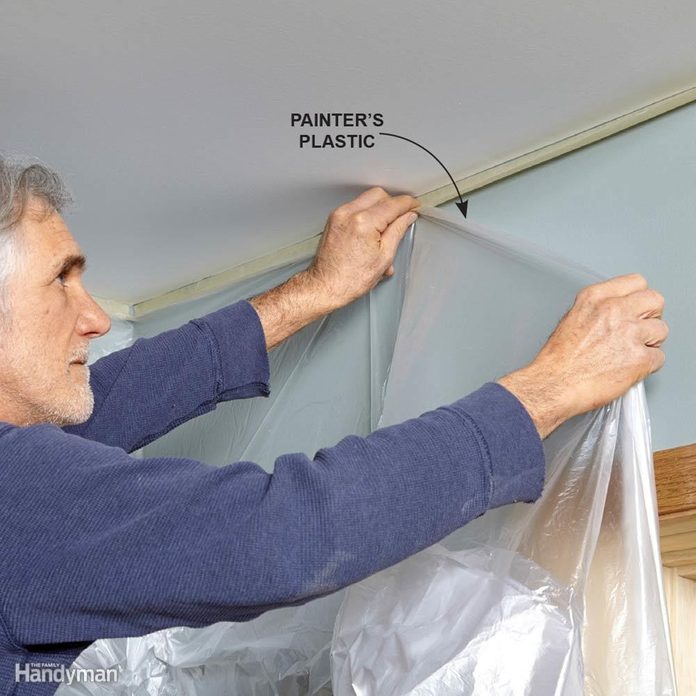Always test first in an inconspicuous area to make sure the tape doesn’t pull paint from the wall. Super-thin “painter’s plastic” sheeting is a good choice for this type of taping because it’s inexpensive and lightweight, and it produces less waste. Overlap the plastic at doorways to create an opening.