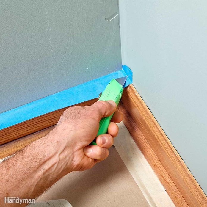 It’s easy to get a perfect fit on inside corners with this simple technique. To prep for painting corners, start by running the first piece of tape up the wall, making it a little long. Press the tape down into the corner with a putty knife. Then cut along the crease with a sharp utility knife and remove the cutoff piece. Now you won’t have to be so careful with the next piece.