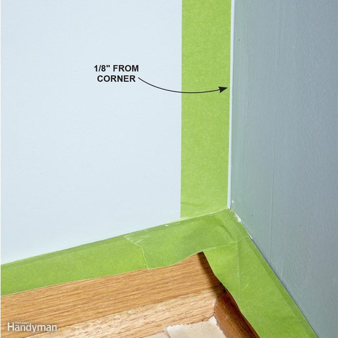 But don’t try to tape right down the corner. Instead, move the tape about 1/8-in. from the corner where it will be easier to get a perfectly straight line. Nobody will ever notice that one paint color extends slightly past the corner, and you’ll end up with a straight, crisp color change.